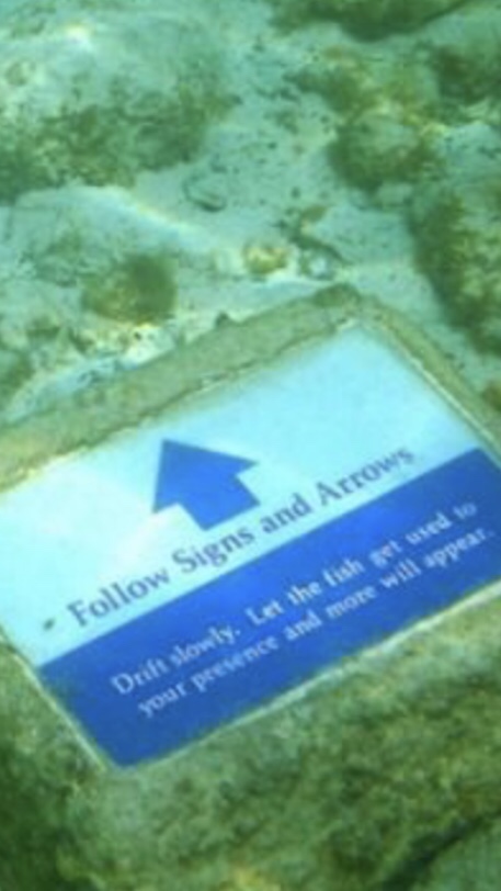 Snorkeling is supposed to be some of the best here so we drop our stuff under a palm tree and don our snorkeling gear. The parks department installed markers underwater near the cay to indicate what fish and coral to look for.