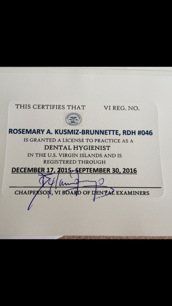I hounded down my VI dental hygiene license and after 100 phone calls and emails, I finally got it and started working a couple of days at St. John Dental since he already had a dental hygienist who was working the other four days.