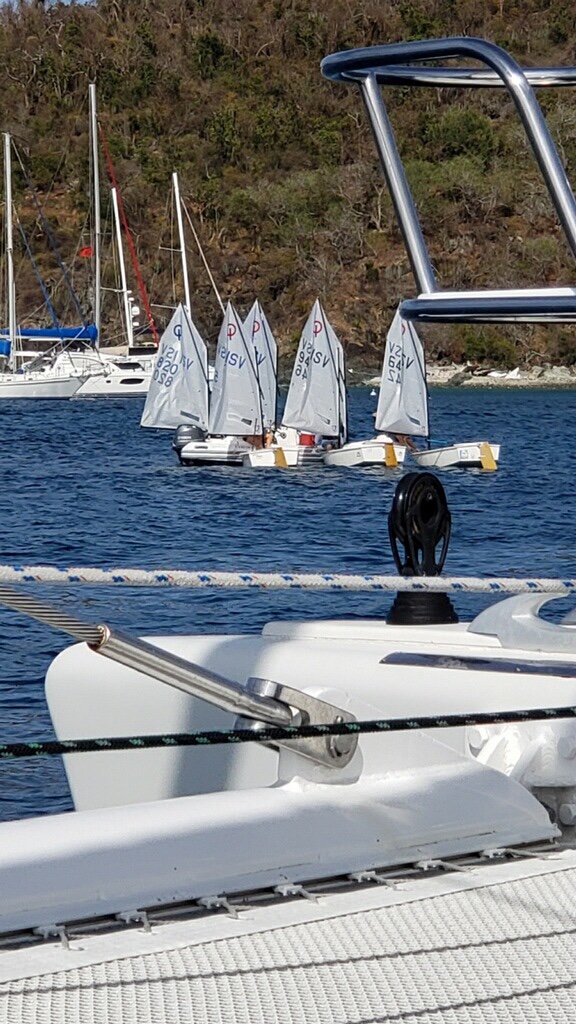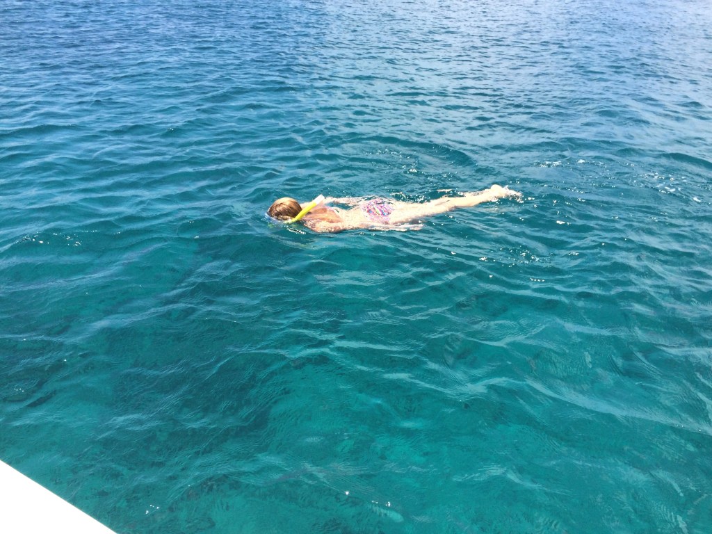 The snorkeling is fantastic! We snorkel for an hour not realizing time is passing with such breathtaking underwater beauty of colorful tropical fish and coral. When we get back on board to rest , we see some very young kids on sunfish sailboats taking sailing lessons from the St. Thomas Yacht Club.