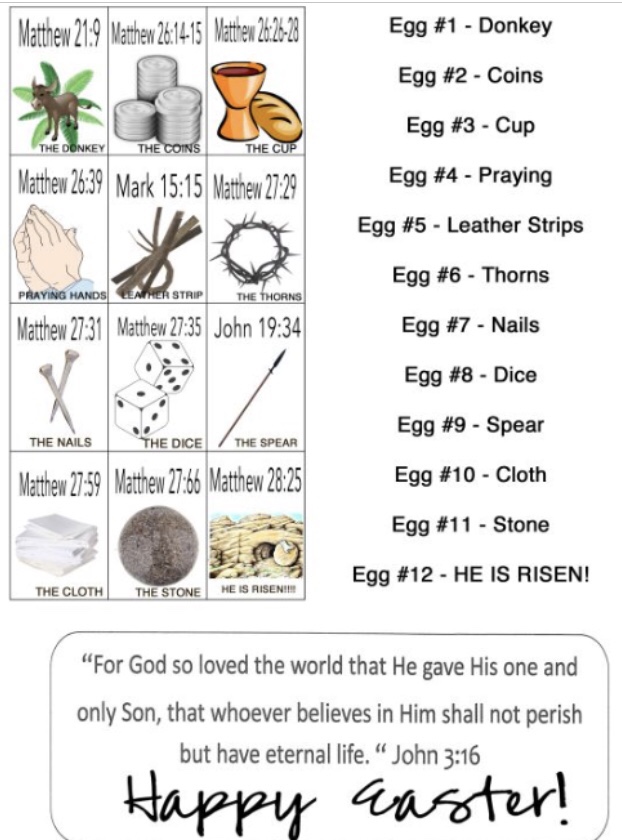In egg #1, we had a leaf to represent Palm Sunday when Jesus rode into Jerusalem. Egg #2, we put 3 dimes to represent the 30 pieces of silver which was paid to Judas to betray Jesus. Egg #3, we placed a plastic communion cup to represent the bread and wine Jesus shared with his disciples at the Last Supper. Egg #4, we placed a flower to represent the Garden of Gethsemane where Jesus prayed. Egg #5, we placed a knotted piece of twine to represent the whips used to beat Jesus. Egg #6, we placed thorns from a local thorny bush to represent the crown of thorns placed on Jesus’s head. Egg #7, we placed 3 nails to represent the nails used to place Jesus on the cross. Egg #8, we placed dice to represent the lots thrown by the guards for Jesus’s garments (as predicted in the Old Testament). Egg #9, we placed a stick to represent the spear used by the guard to make sure Jesus was dead. Egg #10, we used a small piece of linen cloth to represent the linen Jesus was wrapped in to be placed in his tomb. Egg #11, we used a large rock to represent the boulder that was placed in front of the tomb so no one could steal His body. Egg #12, is empty to represent the empty tomb, Jesus’s resurrection from the dead.