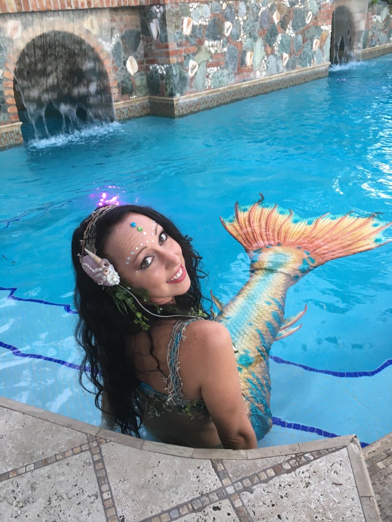 She has mermaid tails of all colors, designs and sizes for those who want to experience swimming as a mermaid, for parties and/or for photo shoots.