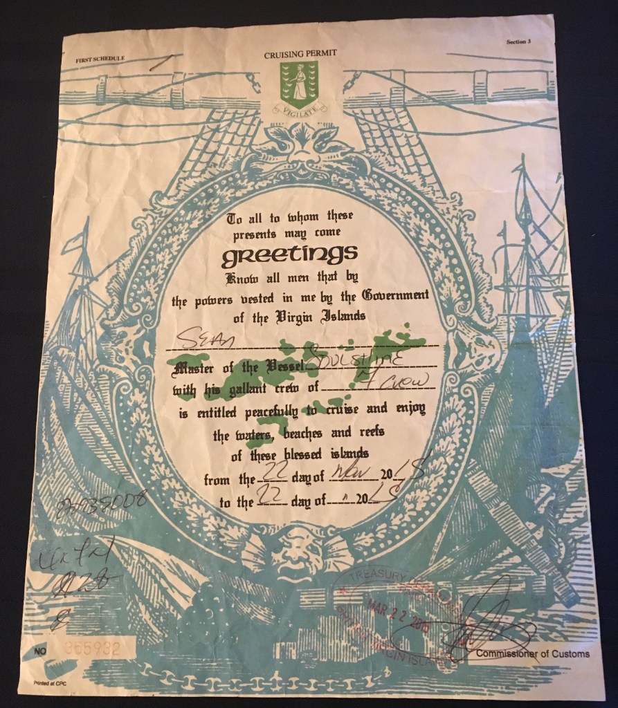 So now we are off to the B.V.I. !! Now there is this thing called the invisible border in the ocean separating the USVI and the BVI. As a boat captain, you have to know your coordinates quite well to know when you are entering water governed by the British. There are British patrol boats monitoring the waters so all vessels must check in with BVI Customs and Immigration immediately upon arrival.