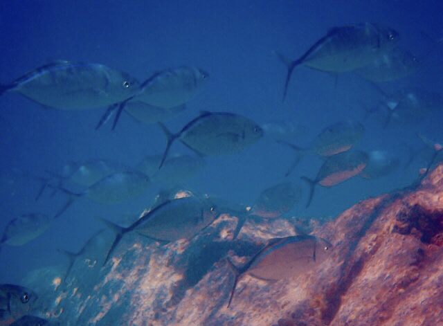 Bar Jack fish are nearly translucent and swim in schools with adolescents and adults all together. Most fish swim in schools according to size so this makes them an unusual group. They are not afraid of people and will come right up to you if you are standing or swimming in the water.