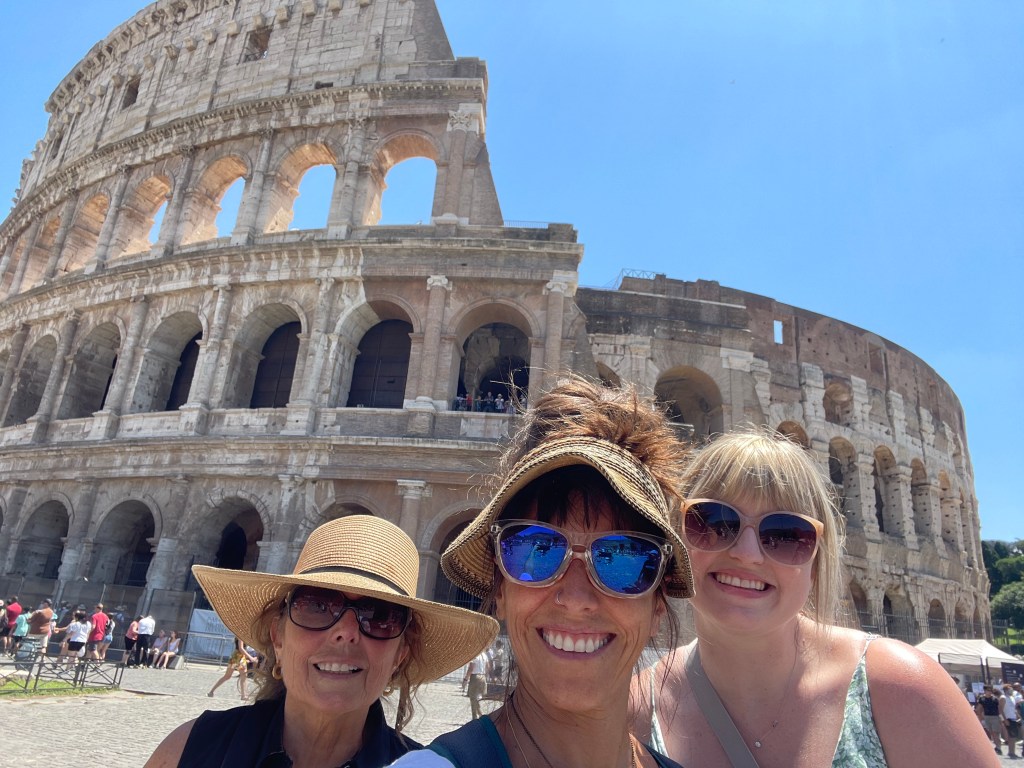 The next day, we planned to visit the Colosseum but first was a stop for breakfast. We sat at a local outdoor cafe having cappuccino for Michelle, caffe Americano for me and Molly, a sparkling lemon soda. Of course, we ate pastries and fruit but we tried not to overindulge since we knew lunch and dinner would be another tasty affair😋