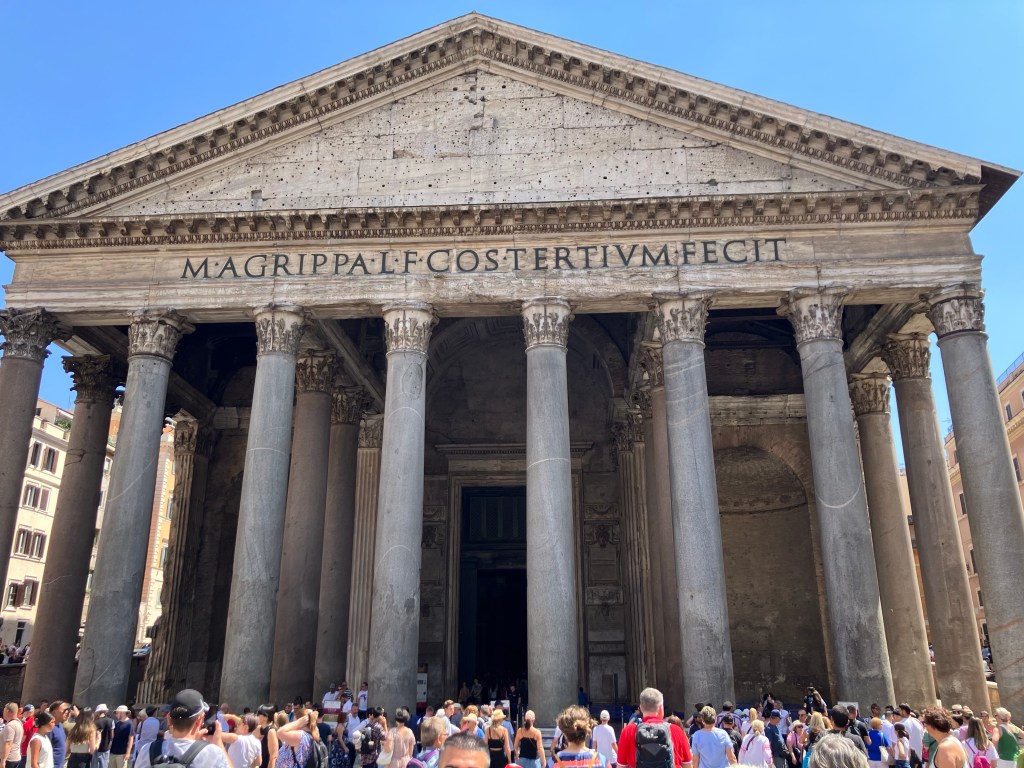 It was already beginning to be a very hot, steamy day, and we made our way over to the Colosseum. Luckily, we had brought umbrellas and knew our wait was going to be very long in the sun, There was an extremely long line for tickets for the tour but while we were standing there, someone approached me and offered us an opportunity to purchase tour tickets without waiting in line. They cost just a little bit more but you didn’t have to stand in line. I was skeptical at first, but when I went over to where he was signing us up for the tour, there were many people there already with other tour guides, and it was legit!! The tickets included the Colosseum, the Forum, and the Palatine Hill. Yay! But the tour would not be until 5 o’clock. We decided to take advantage of the time to have a quick lunch, and then take a taxi to the Pantheon.