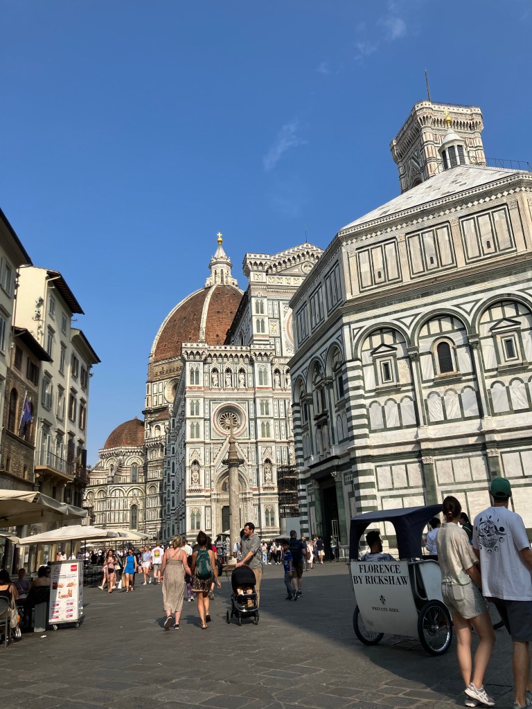 As we walked through the town overwhelmed by all we could see, we came to the plaza of the Cathedral of Santa Maria del Fiore (“Our Lady of the Flower”) built in the 1200’s. Florence (or Firenze, as Italians call this city) means ‘City of Blooming Flowers’. It’s the 4th largest cathedral in the world!